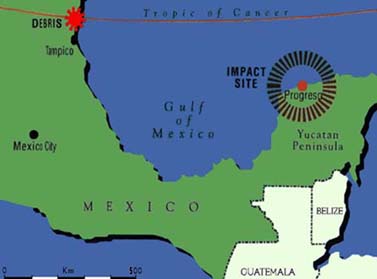 Yucatán en Méjico. Fue de tal magnitud que algunos residuos llegaron hasta distancias increíbles, como demuestra esta ilustración.