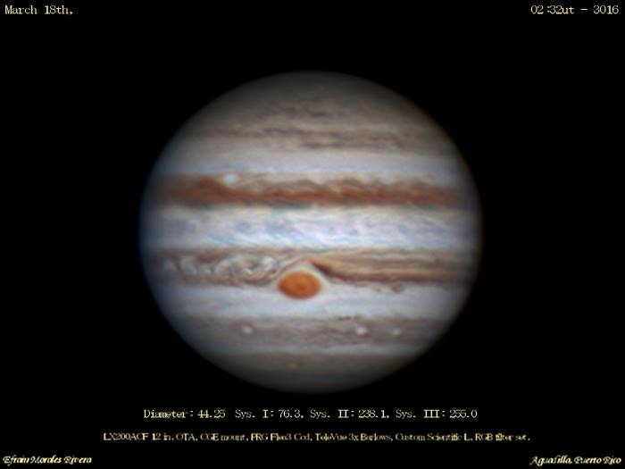 Espectacular imagen de Júpiter y su gran mancha roja, un sistema ciclónico cuyo tamaño es al menos 2 veces el diámetro de la Tierra. Foto por Efraín Morales de la SAC.