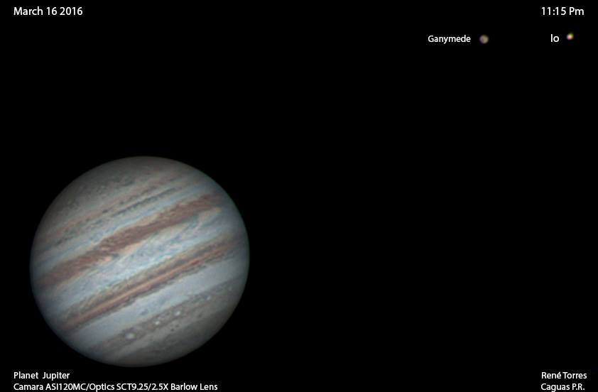 Preciosa imagen de Júpiter y dos de sus 67 lunas o satélites naturales. Foto por René Torres, seguidor de la SAC.