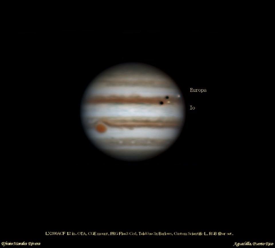Doble Eclipse en Júpiter captado desde PR. Imágenes captadas por miembros y seguidores de la Sociedad de Astronomía del Caribe (SAC). Foto destacada: Espectacular imagen del planeta Júpiter y dos de sus 67 lunas o satélites naturales. La imagen muestra al “rey de los planetas” junto a las lunas Europa e Io, así como sus eclipses o sombras proyectadas en el enorme planeta. Foto captada a través de un telescopio Meade de 12 pulgadas de diámetro, por Efraín Morales de la Sociedad de Astronomía del Caribe (SAC).