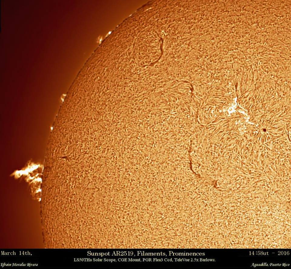Impresionante foto del Sol mostrando una prominencia que luce como una llamarada en el borde del Sol. Foto captada a través de un telescopio con filtro de hidrógeno-alfa, por Efraín Morales, de la SAC.