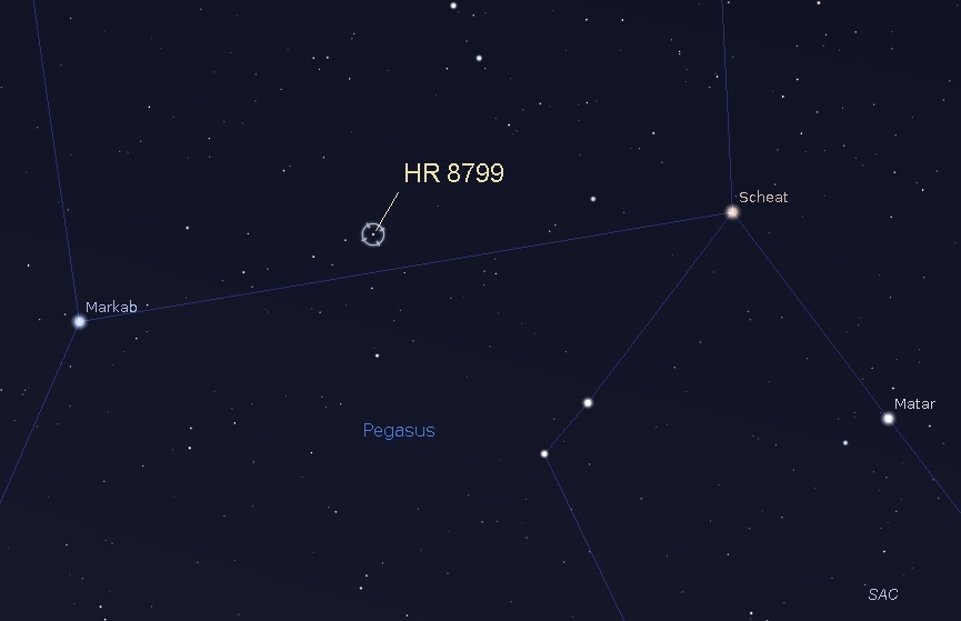 La estrella HR 8799 está ubicada en la constelación de Pegaso a una distancia de 129 años-luz y curiosamente está localizada bien cerca de "51 Pegasi", la estrella a la cual se le detectó el primer planeta extrasolar en el año 1995.