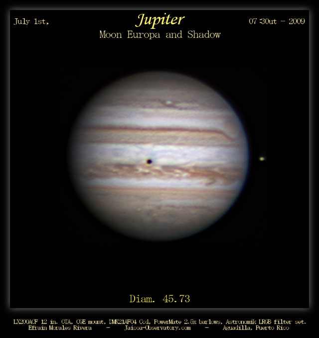 dos veces el tamaño de la Tierra. Otros posibles detalles visibles ocasionalmente incluyen la sombra proyectada de alguna de sus lunas, visible como un punto negro en el planeta. Este tipo de detalle lo hemos visto en algunas de nuestras Noches de Observación y es una curiosa perspectiva ya que estamos viendo un eclipse en otro planeta.