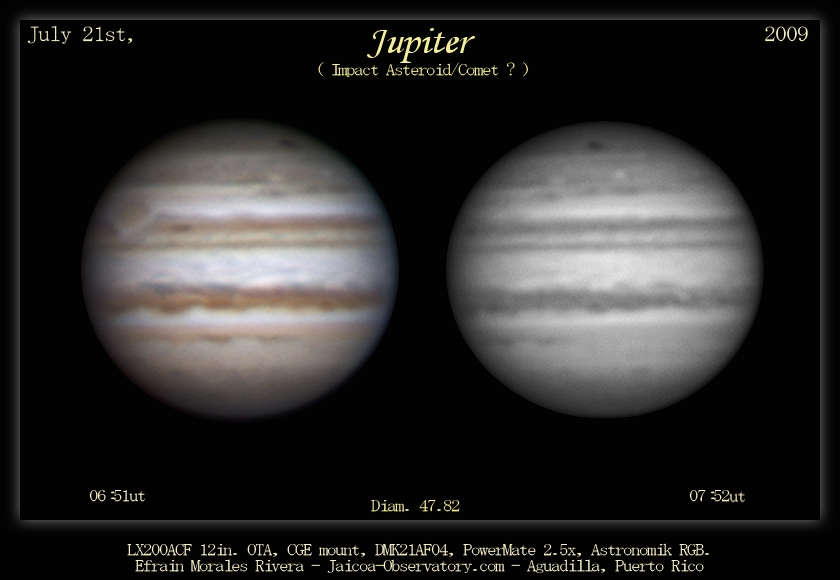 Detectado originalmente por el aficionado Anthony Wesley de Australia, posteriormente la NASA confirmó que se trata de un posible cometa que acaba de impactar a Jupiter ; un evento similar a cuando el cometa Shoemaker-Levy impactó a Jupiter en el 1994 dejando manchas del tamaño de la Tierra Ver FOTO