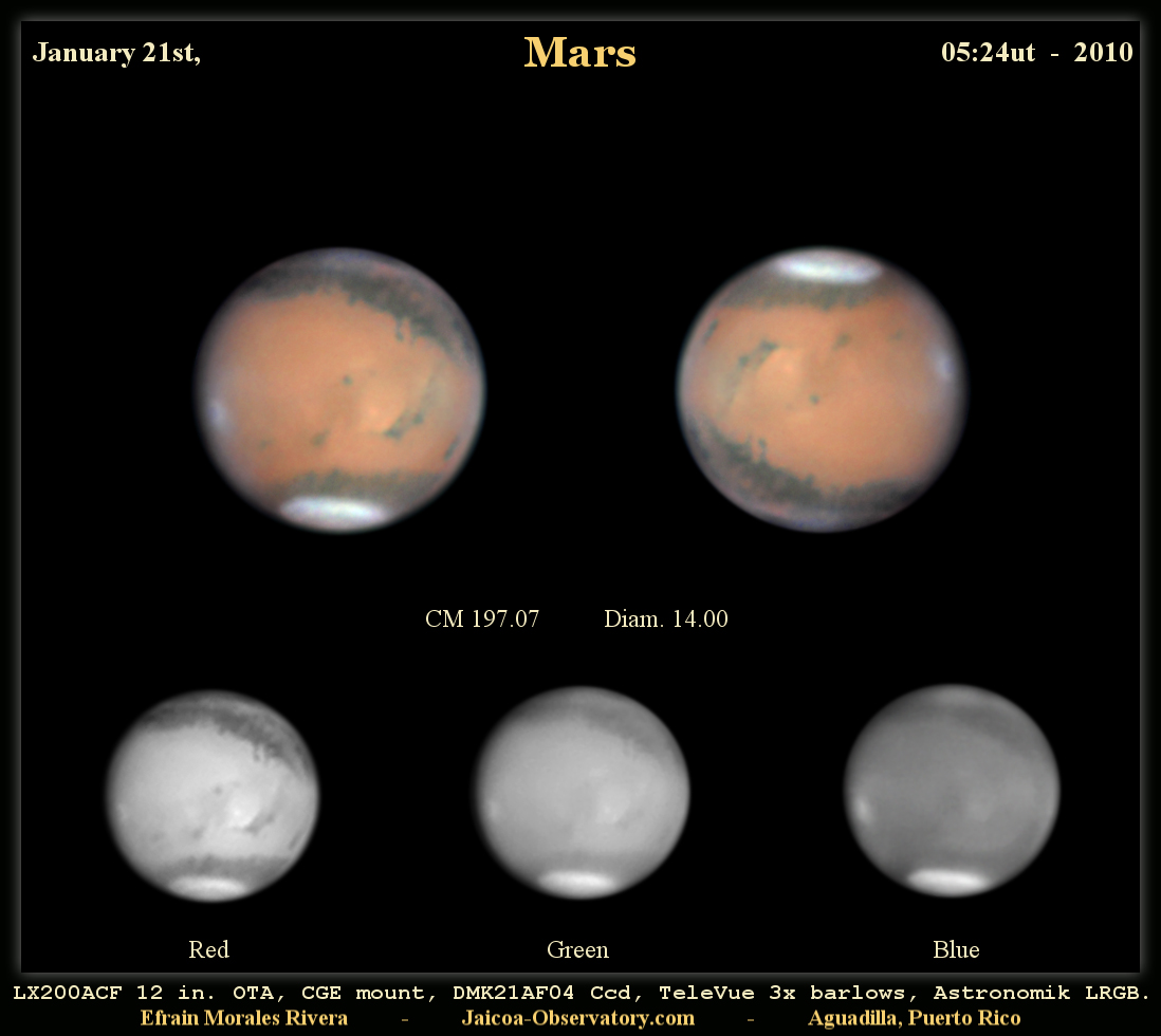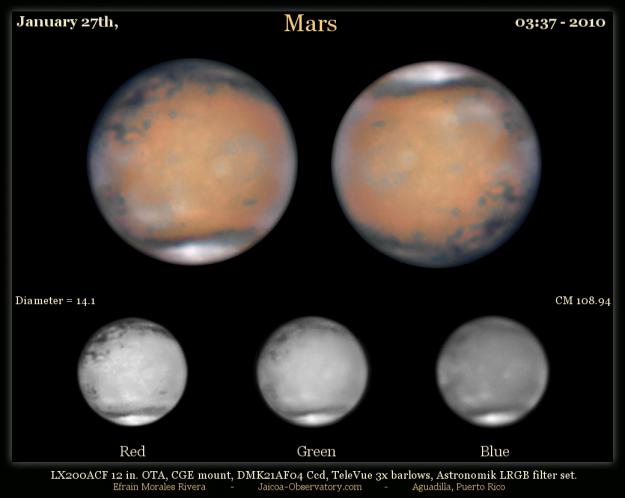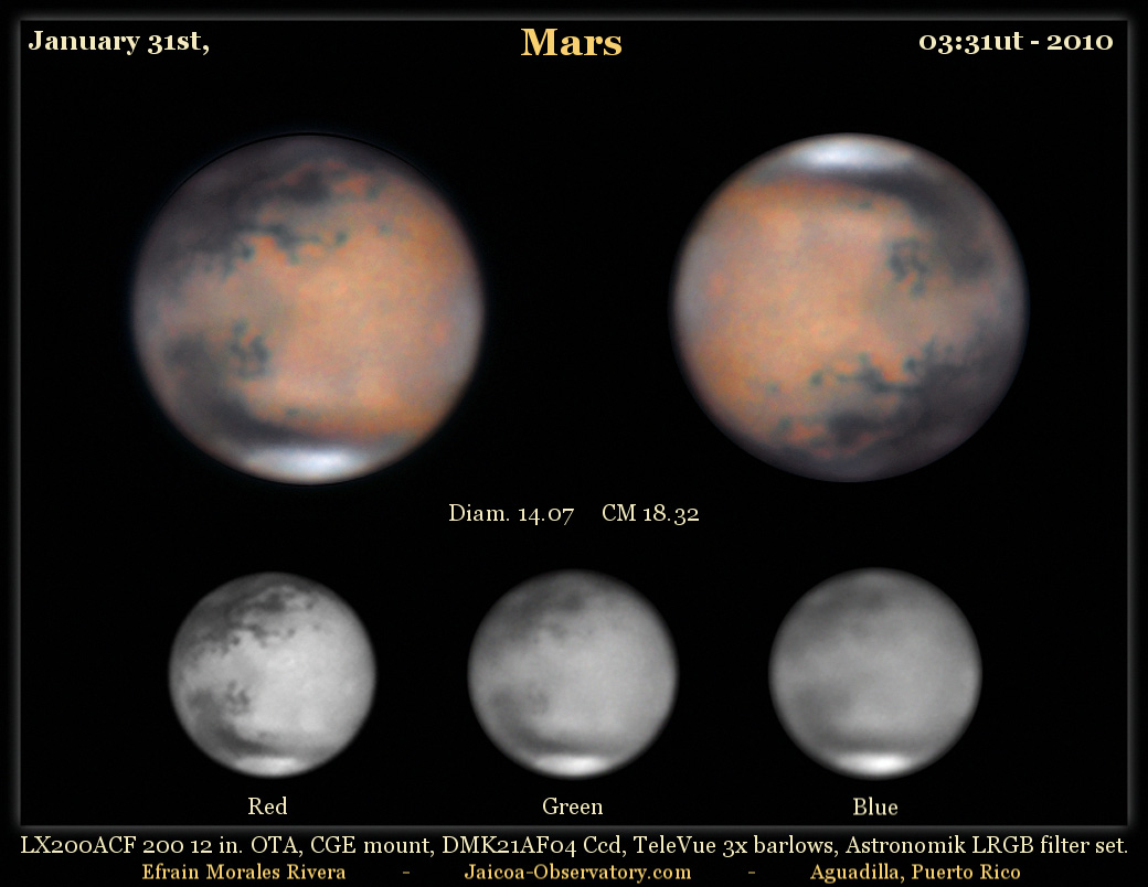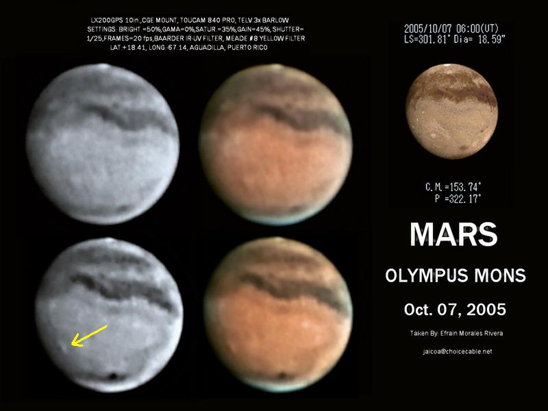 con telescopios e increíblemente en las fotos son visibles detalles como el volcán Monte Olympus (el más grande del Sistema Solar) Vea una foto previa por nuestro miembro Efraín Morales, de Aguadilla, PR. Vea también otras fotos recientes captadas