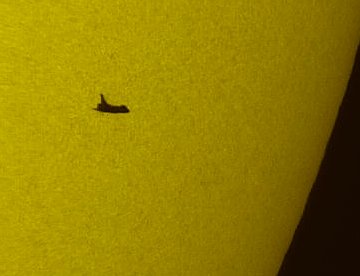 Tambien logró obtener otra foto del Sol en la que se ve claramente la silueta del Atlantis pasando frente a nuestra estrella: