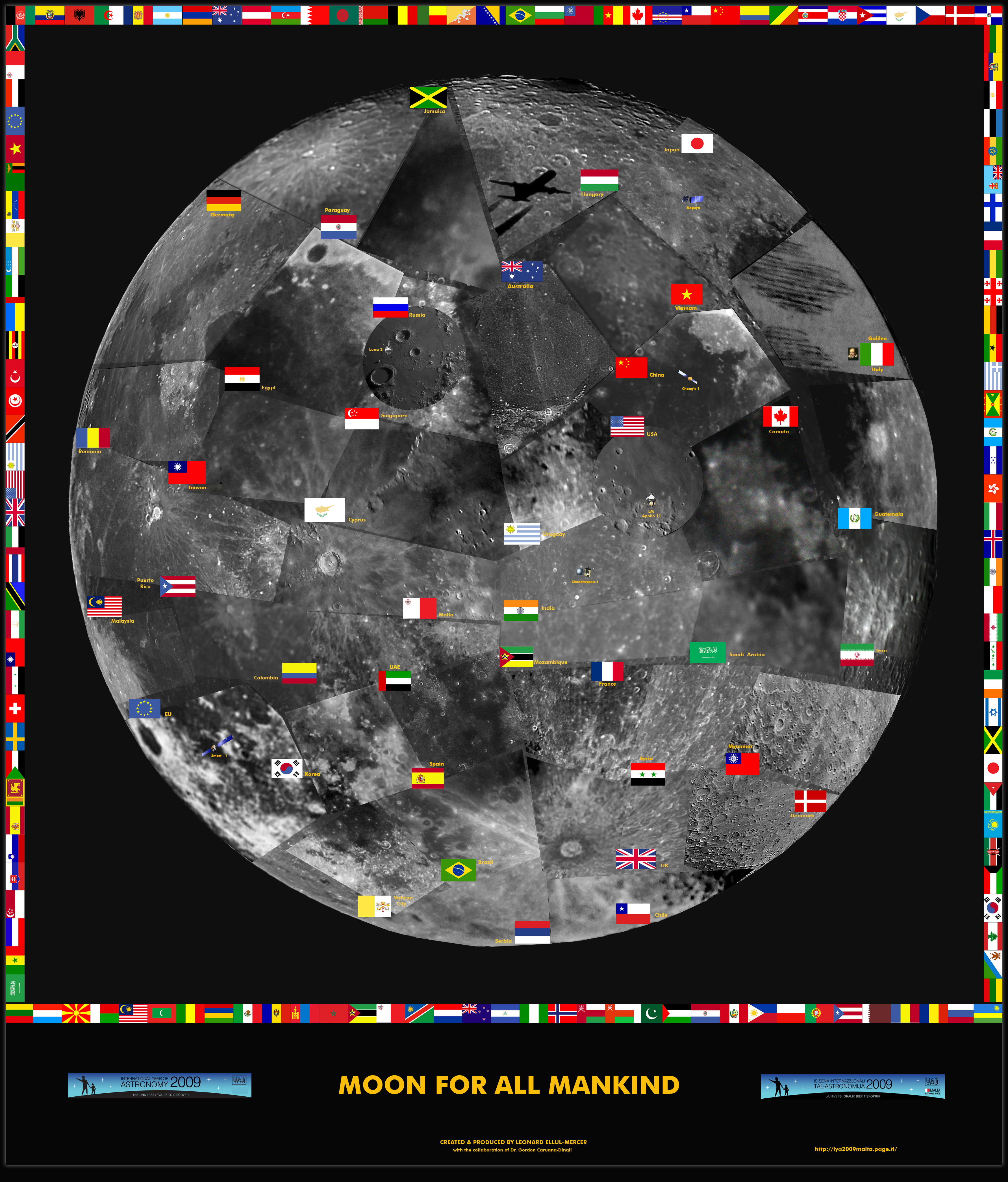 Recientemente se realizó un proyecto en el cuál astrónomos de varios países tomarían fotos de la Luna para crear un gran mosaico. El proyecto es una conmemoración de los 40 años de la Llegada del Hombre a la Luna.