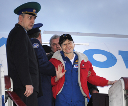 La astronauta norteamericana Peggy Whitson parece expresar "estoy viva" al saludar a su llegada a un aeropuerto ruso. Esta indicó que se percató que algo andaba mal pues el descenso se sintió terrible y en un momento dado observó que un instrumento registraba 8.2 G's ( 8.2 veces la fuerza de gravedad ). Lo más que habían sentido tripulantes previos eran 5 G's. Whitson aparece en la foto de la derecha (al centro) junto a los demás tripulantes que estuvieron con ella en la Estación Espacial.